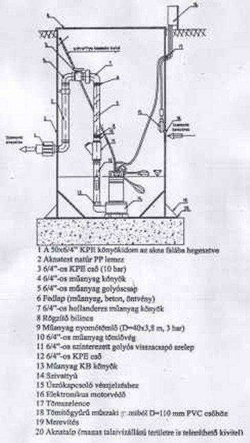 Az átemelök Ć700 mm-es átméröjü, H=1400 mm magas és 5 mm vastag szennyvíznek anyagában ellenálló müanyag aknából, lépésálló 4 cm vastag betonból, müanyag, vagy öntöttvas fedlappal, kúpos aljjal készül